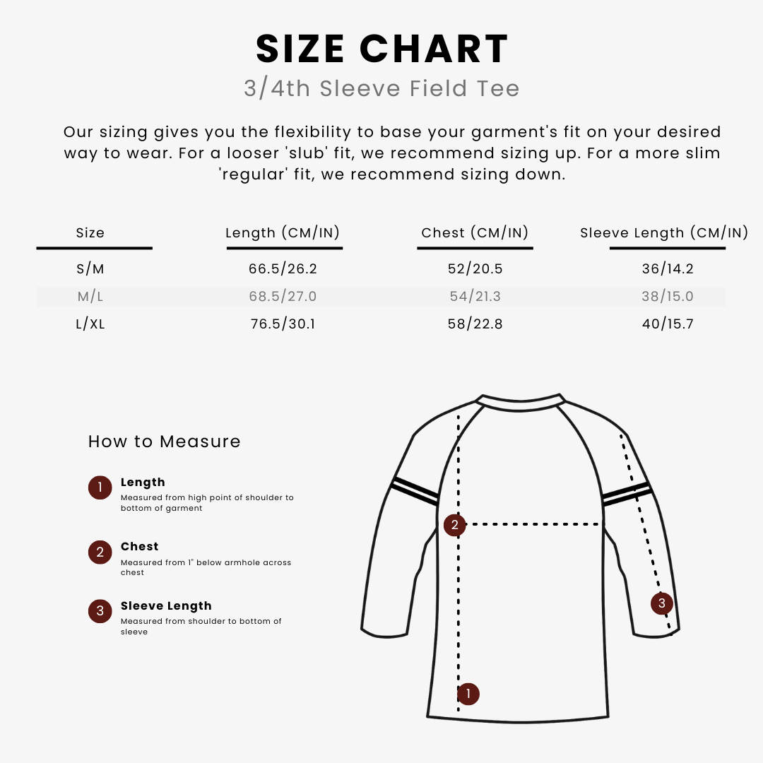 A true nod to vintage. This piece was inspired by those timelessly cool baseball tees you’ve been tirelessly hunting for in thrift stores everywhere. Made from 100% cotton, this piece is designed for a slightly loose fit and features 3/4th length sleeves decorated with hand-stitched ribbon striping. The detailing is really something else.