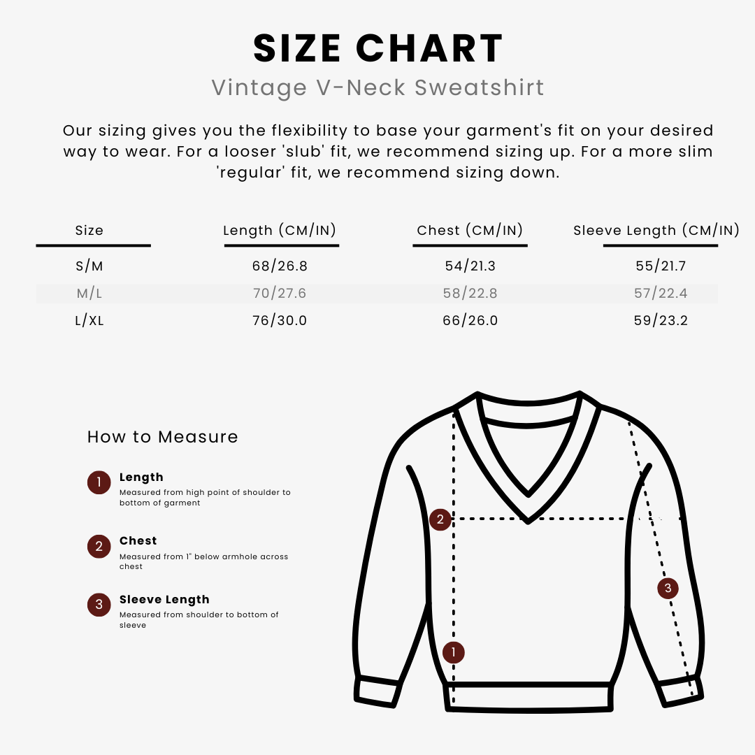 A nod to our best-selling lightweight Vintage V-Neck Sweater, we gave this piece a heavier update in sweatshirt form. The body is made from 100% jersey cotton, giving it that cozy sweatshirt feel. The neck and cuff trim features the same knit as the original, blending sweater and sweatshirt into one cohesive piece. It’s timeless, versatile, and incredibly comfortable. Wear it by itself or as an extra layer – either way its vintage fit and aesthetic will give you that sprezzatura you’ve been looking for.