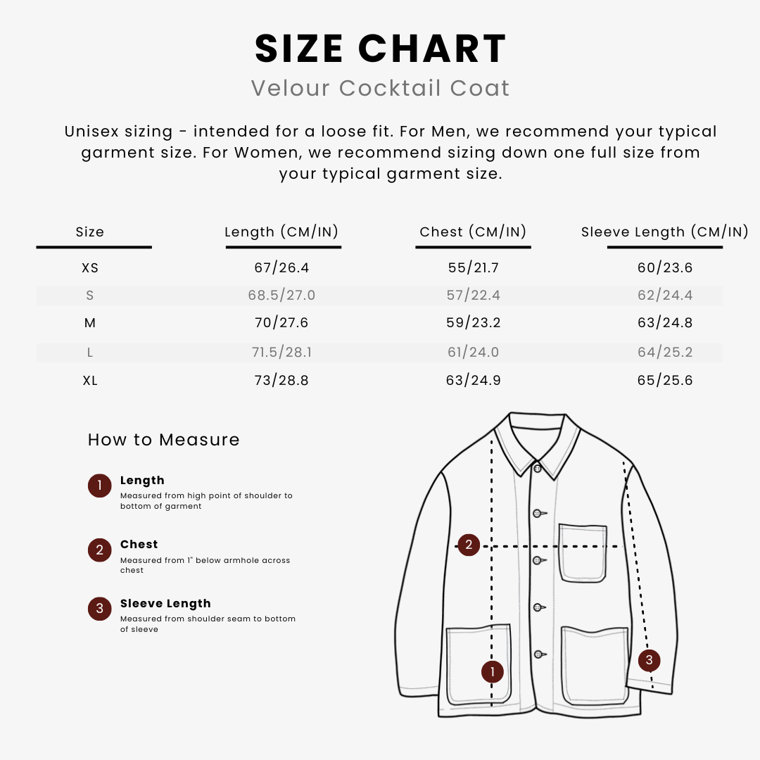 Inspired by vintage Italian-design, our Velour Cocktail Coat is the definition of functional elegance. Designed for a loose, deconstructed fit, it can be worn dressed up or down. It looks particularly sharp when worn in lieu of a tuxedo jacket with your formal attire. Featuring two side pockets and a left chest pocket, it's about as versatile as it gets. Designed for both Men & Women.